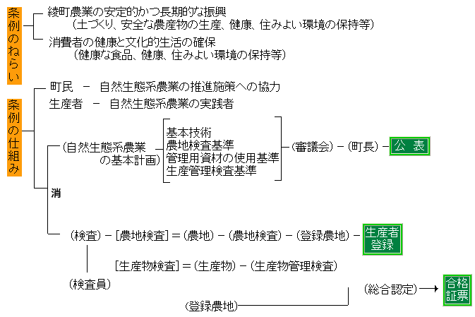 綾町では、農業の近代化がもたらした歪みを反省し、農産物の安全性と、自然環境にも調和した農業を推進するため、平成元年から図に示すような自然生態系農 業の基準の設定と、基準の審査方法及び、審査結果による認証方法など一連の厳しい基準と明確なラベルの表示を行っております。